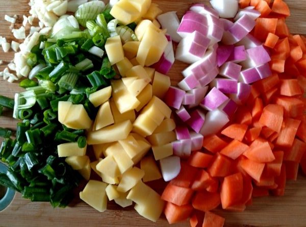 (on me l’indiquait mais j’oublie – j’oublie beaucoup, je change, je ne suis pas de cette classe, ça me désole mais c’est le cas ce n’est pas mon monde) menu du soir (j’ai ajouté un oignon et du gingembre – ciboulette et persil)